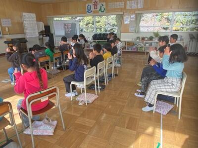 2組は音楽。いつもの発声練習は日直が前に立ち体を動かしながら行います。
