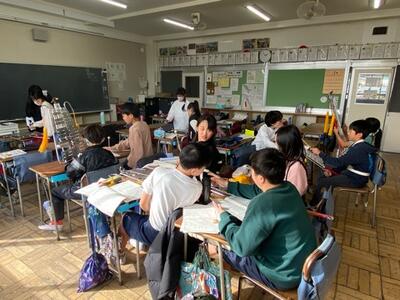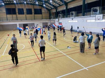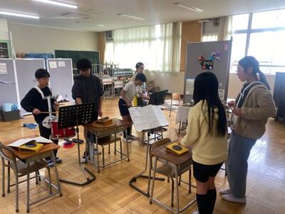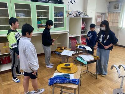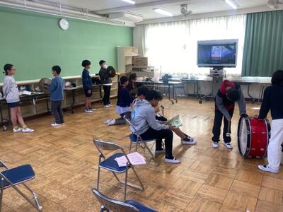 現在、6年生から5年生に鼓笛の引継ぎが行われています。担当ごとに師匠の6年生が弟子の5年生に演奏を教えます。どちらも真剣そのもの。こうして伝統は継承されていきます。