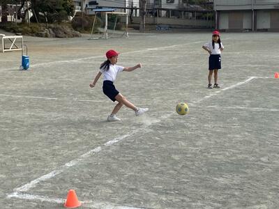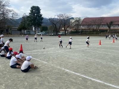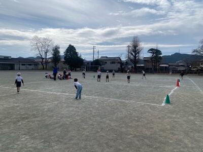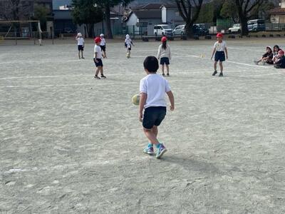 1・2・3組合同でボール蹴りゲーム大会。三つのコートに分かれ白熱の試合です。