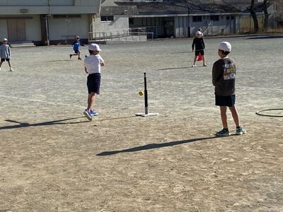 1組は校庭で体育、ティーボールです。ボールをよく見てバットに強く当て、人がいない所に打つのがコツです。