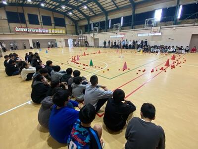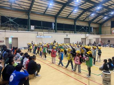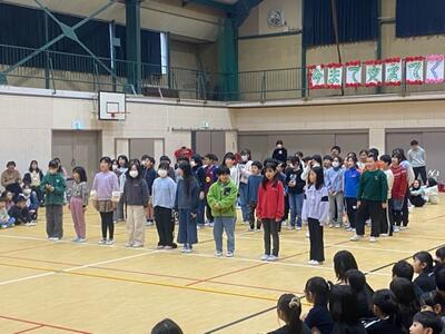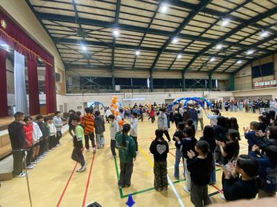 昨日の6年生を送る会に続き、今日は卒業を祝う会。保護者の方の企画で「チェッコリ玉入れ」でおうちの方とスポーツ交流